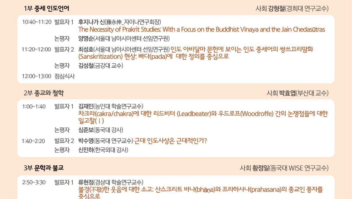 1부 ‘중세 인도언어’ 세션에서는 후지나가 신(자이나연구회장)이 불교 율장과 자이나교 경전에 나타난 프라크리트어 연구의 중요성을 발표하였고, 이어 최성호(서울대)가 인도 아비달마 문헌에서 드러나는 쌍쓰끄리땀화(Sanskritization) 현상을 중심으로 ‘빠다(pada)’ 개념의 정립을 논의하였다.