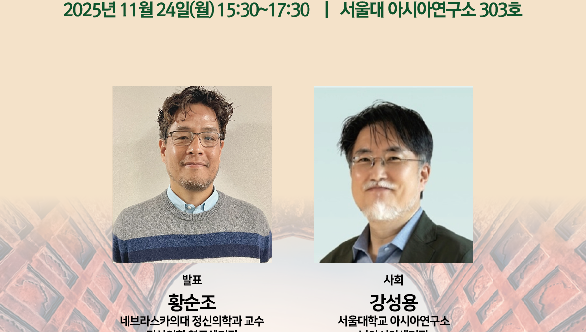 2025년 11월 24일 아시아연구소 남아시아센터에서는 황순조 네브라스타의대 정신의학과 교수 정신의학 연구센터장을 초빙하여, “정신과 임상에서 겪는 인도 수행전통과 fMRI 활용 연구에서 기대하는 인도전통의 미래”를 주제로 특별 워크샵을 개최하였다.